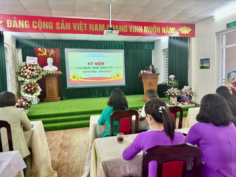 Đại diện Hội Cha mẹ học sinh nhà trường tặng hoa chúc mừng nhà trường và các cô giáo